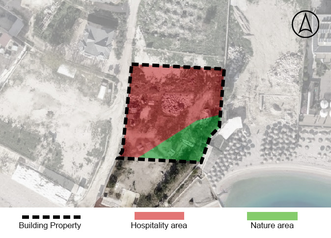 The “Building Property” is divided in two parts according to the local regulations as shown in the image below: 80% painted in red should be developed with the “Hospitality and Services” and the other 20% painted in green will be left natural.